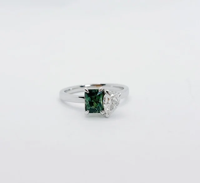 18K White Gold Pear Shape Natural Diamond with Unheated Madagascar Green Sapphire Ring