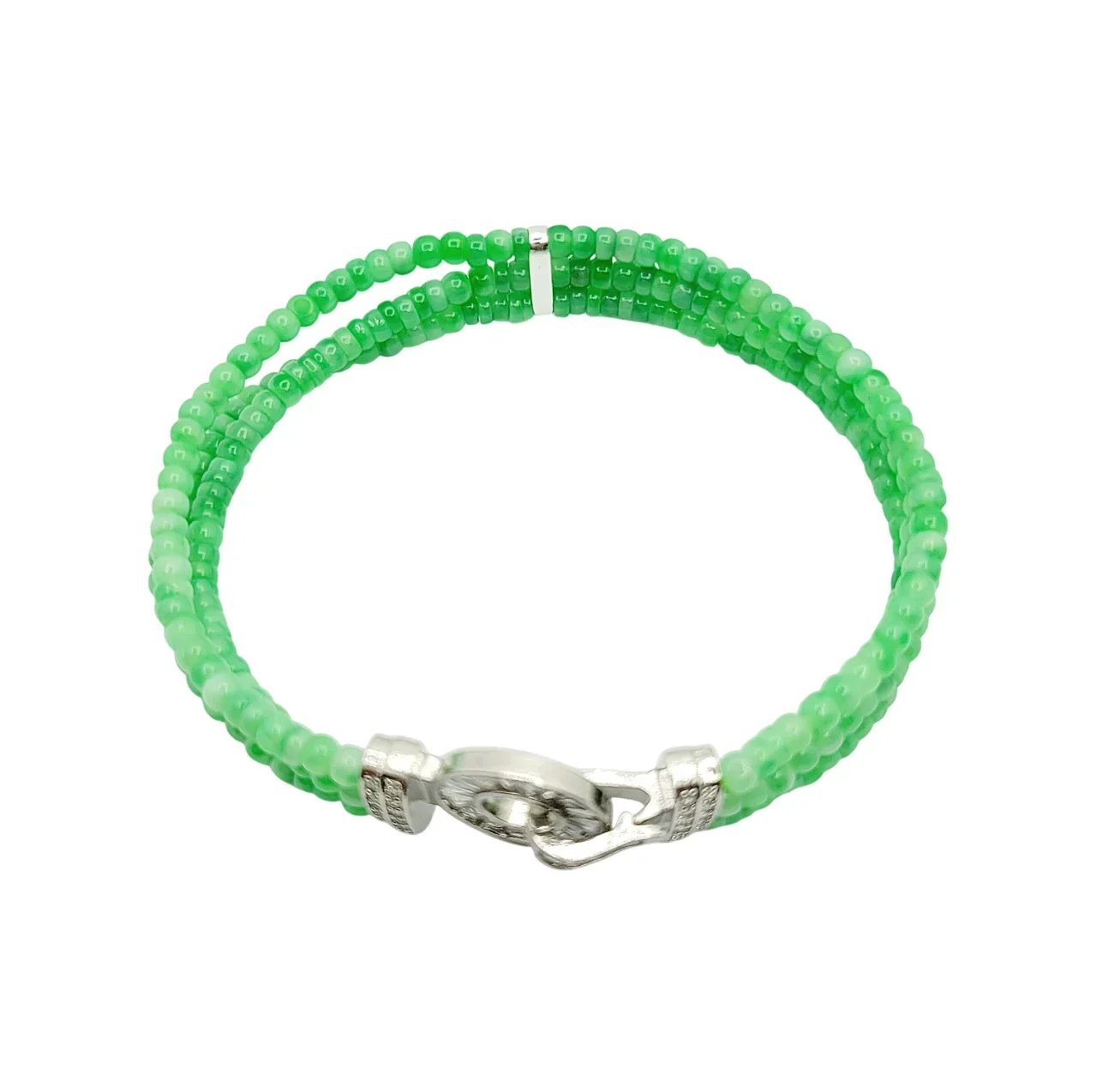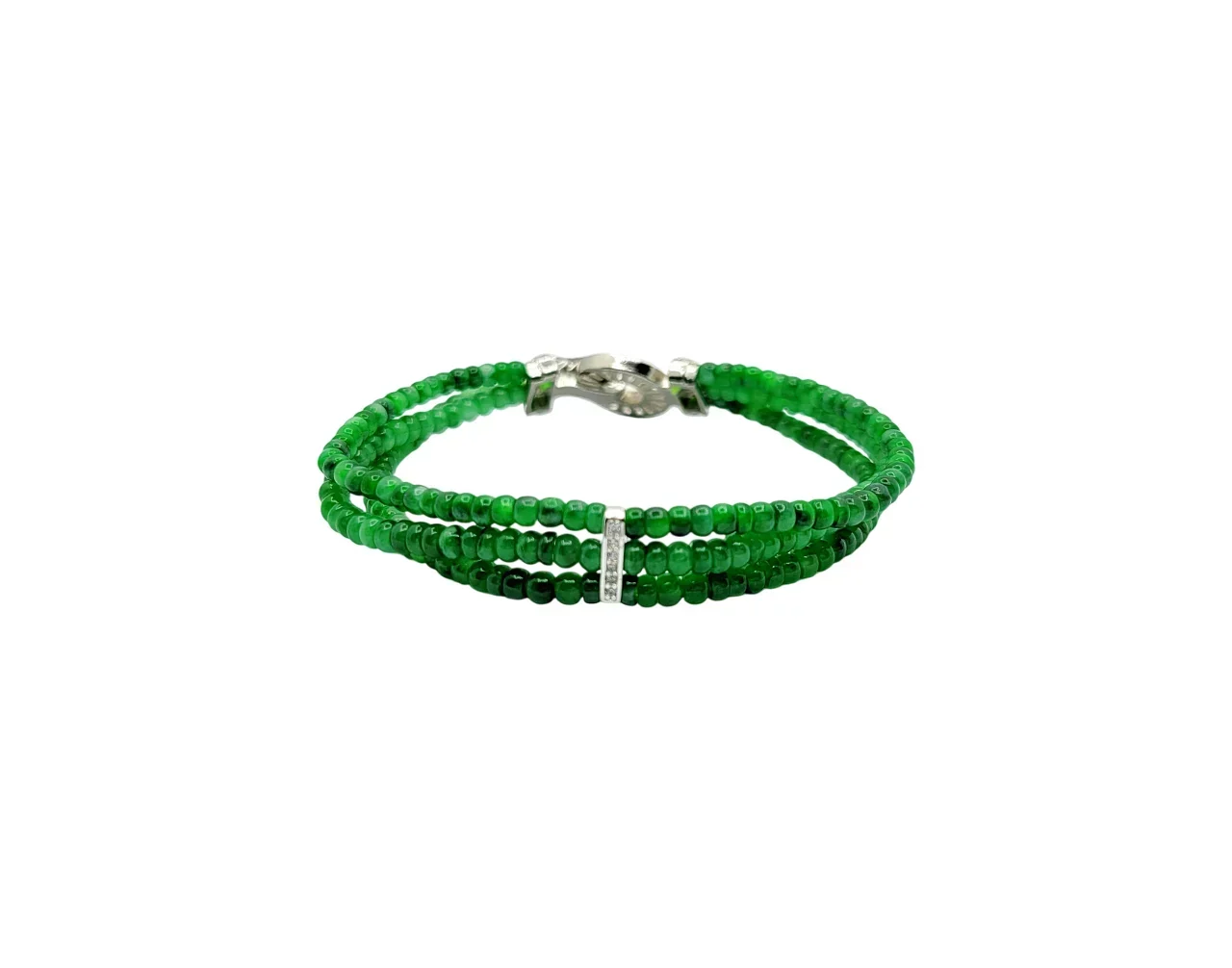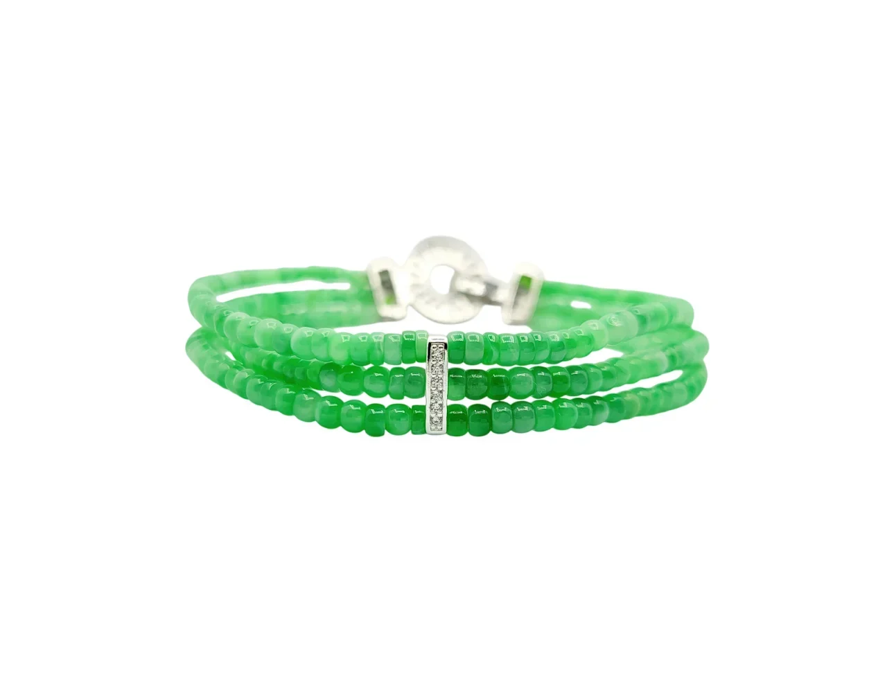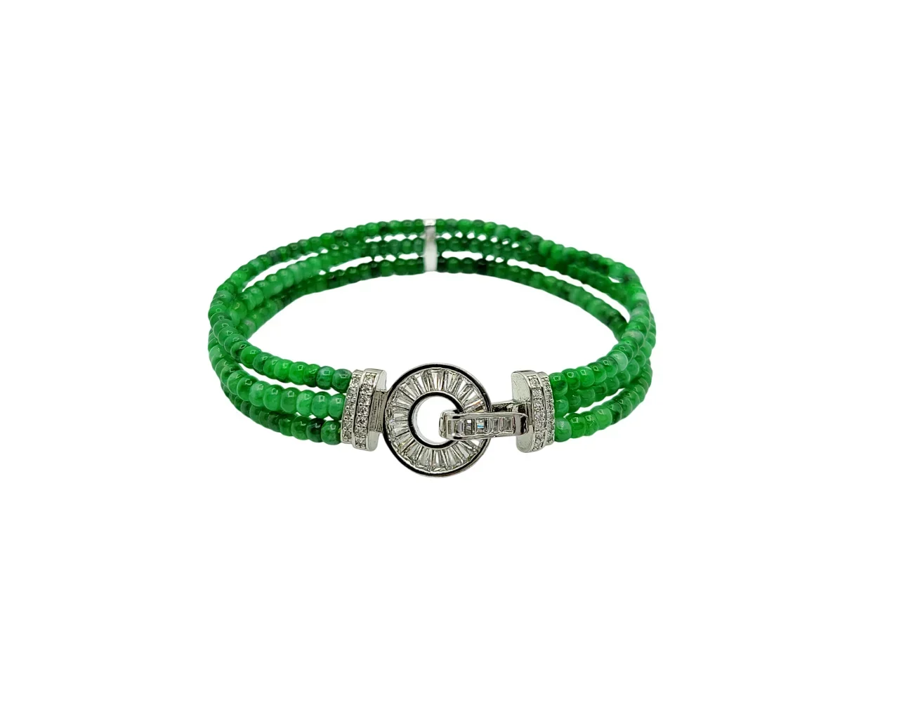 Green Jadeite Jade Beads 3 Rows Bracelet with Diamond Simulant