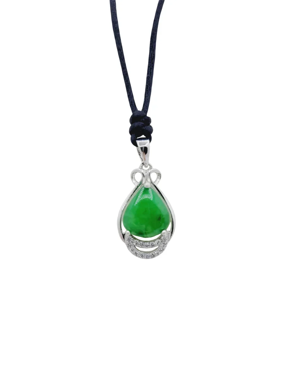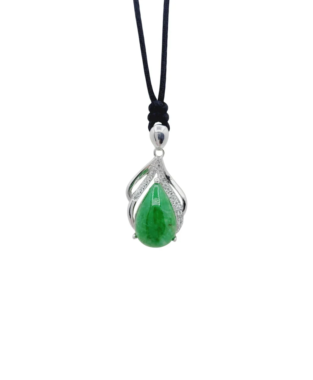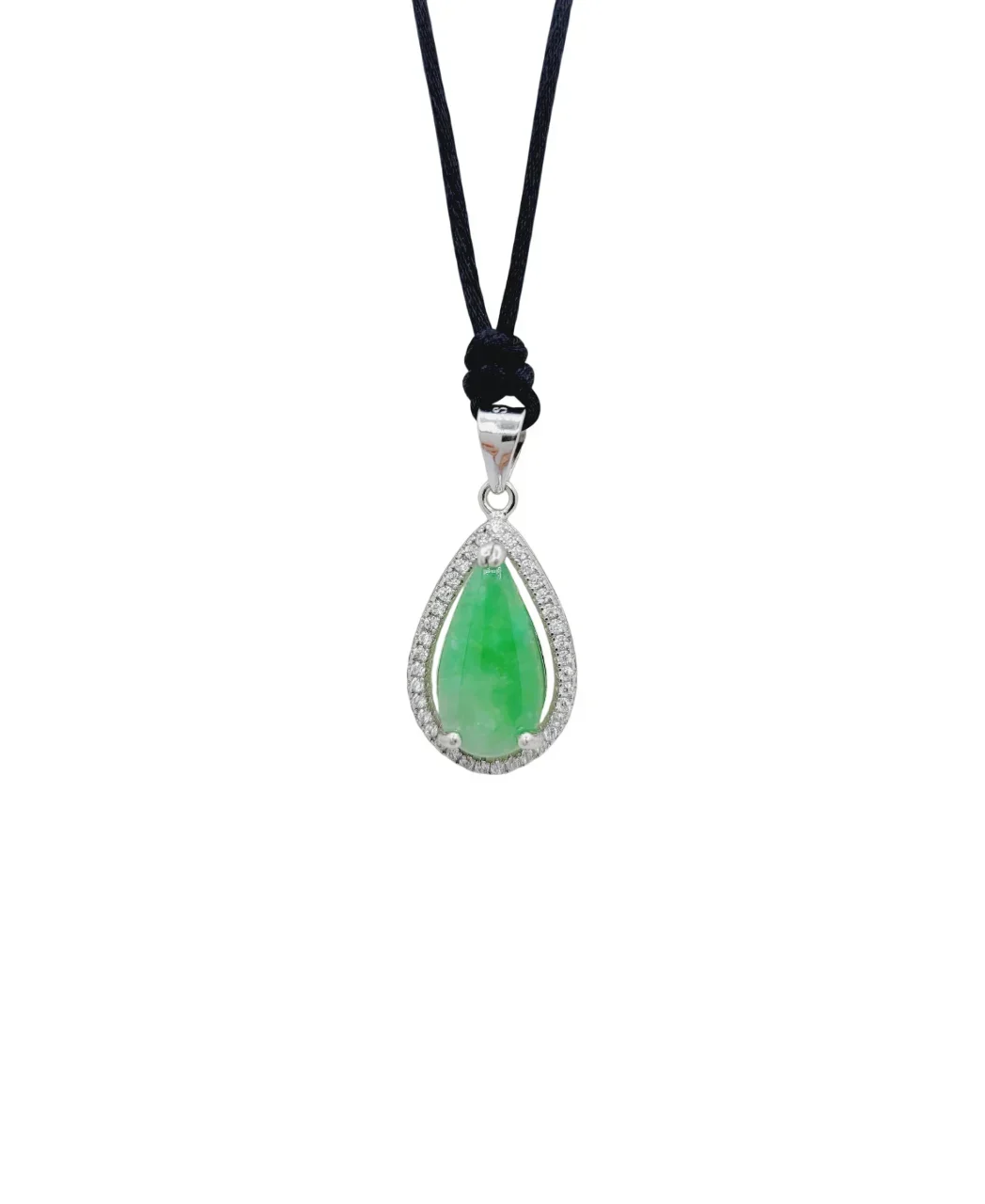Silver Green Tear Drop Jadeite Jade Pendant with Diamonds Simulant
