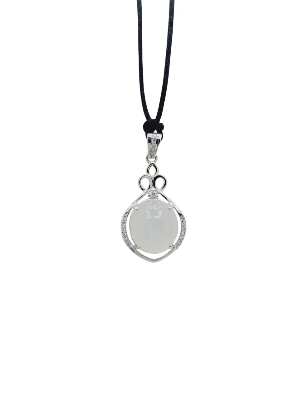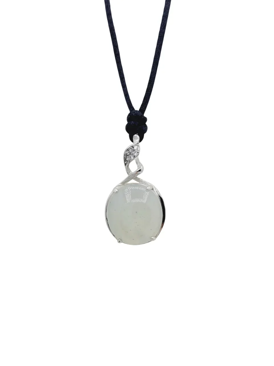 Silver Icy Oval Cabochon Jadeite Jade Pendant with Diamonds Simulant