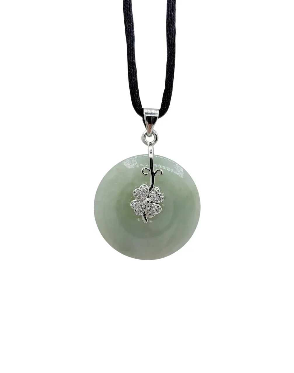 Silver Fortune & Good Health Donut Jadeite Jade Pendant with Diamond Simulant