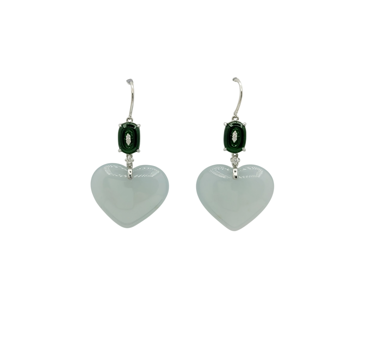 18K White Gold Icy Heart Cabochon Jadeite Jade Earrings with Natural Diamonds